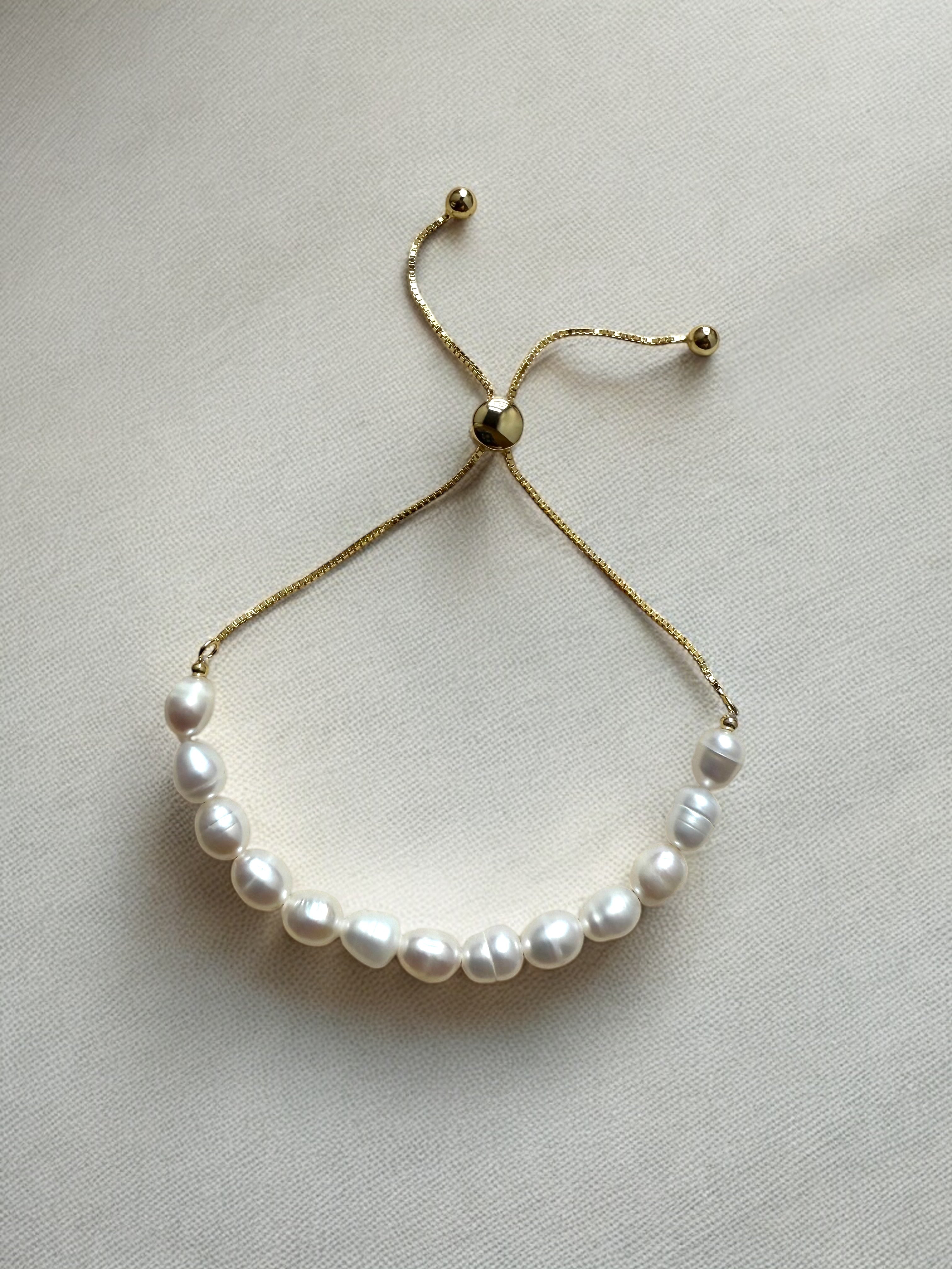 This beautiful design is a classic elegant style with a contemporary minimal twist. Made with natural fresh water pearls and Gold plated Sterling Silver. This design is adjustable using the the toggle feature which smoothly slides along the snake chain to a size that suits.