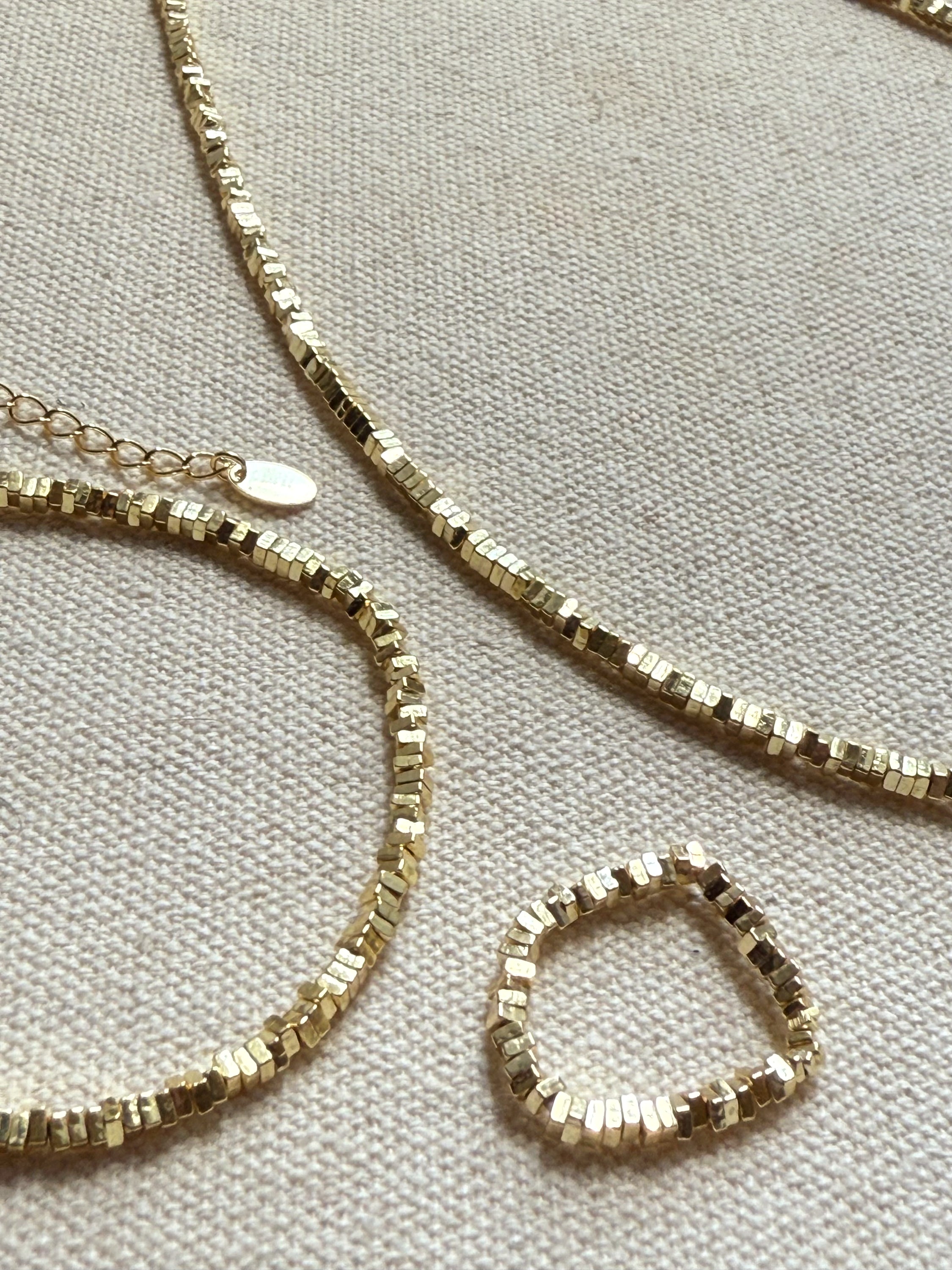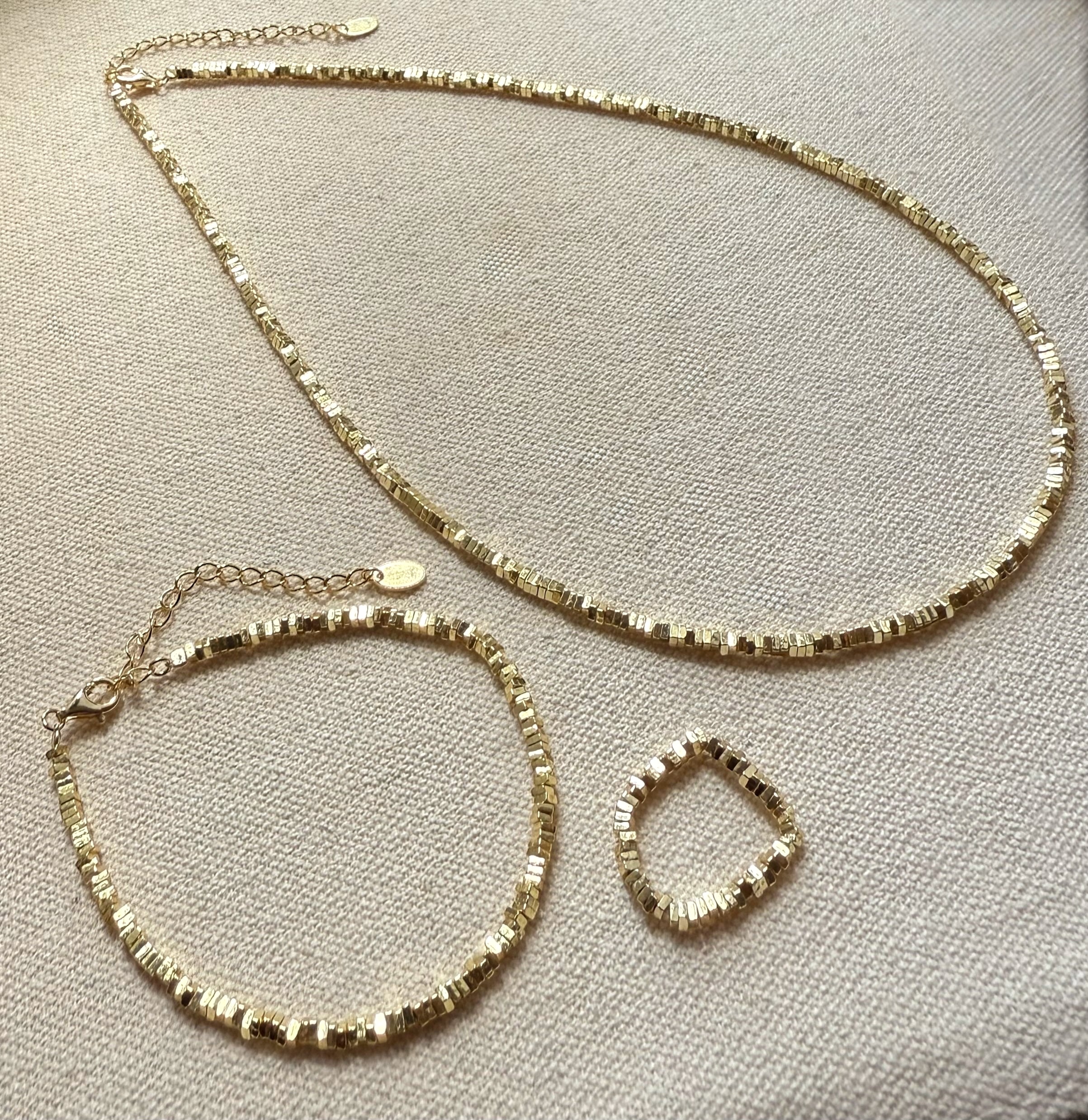 This stunning gold plated sterling silver jewellery set is a must have addition to your accessory collection. Effortlessly cool, easy to style with evening wear or casual trendy looks. The beautiful gold square bead design offers a gorgeous weighty structure and being slightly thicker than some of our other versions with pearls, this unembellished style is a statement all of it's own. Matching bracelet and ring to necklace, this set is classic and classy.