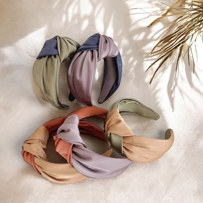 This gorgeous two tone satin top knot head piece is stylish, comfortable and fun. A great way to infuse a mixture of colour to look, whether dressy or casual. This top knot style is the perfect accessory for occasions and pairs beautifully with many of our High Tide earrings. Available in variety of beautiful tones.