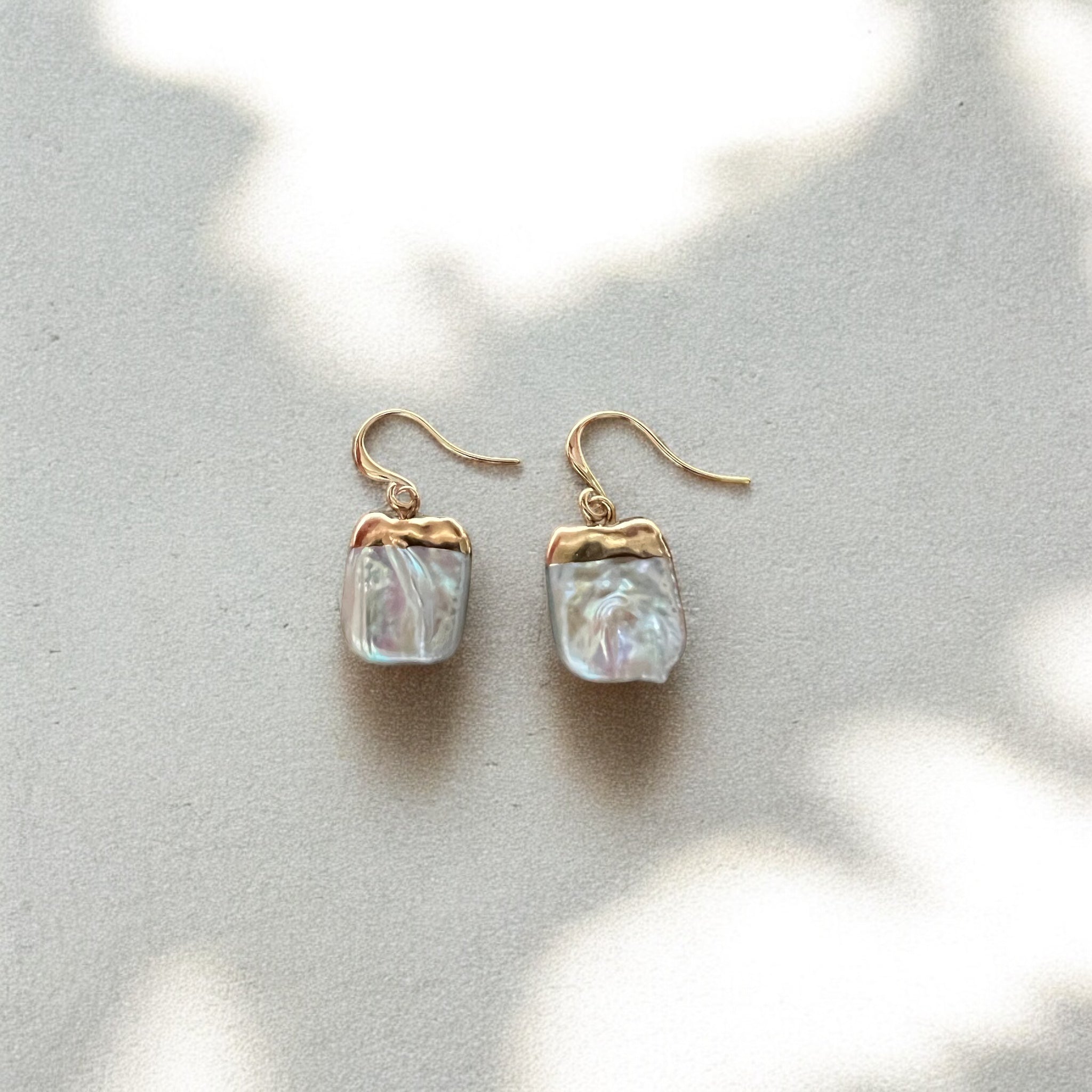 These stunning earrings are made from real pearls. The unusual square design feauture beautiful dipped gold finish on our elegant gold plated earring hooks. Perfect for styling up your everyday casual looks or to special occasion wear. They make the perfect gift to self or other and are locally made.