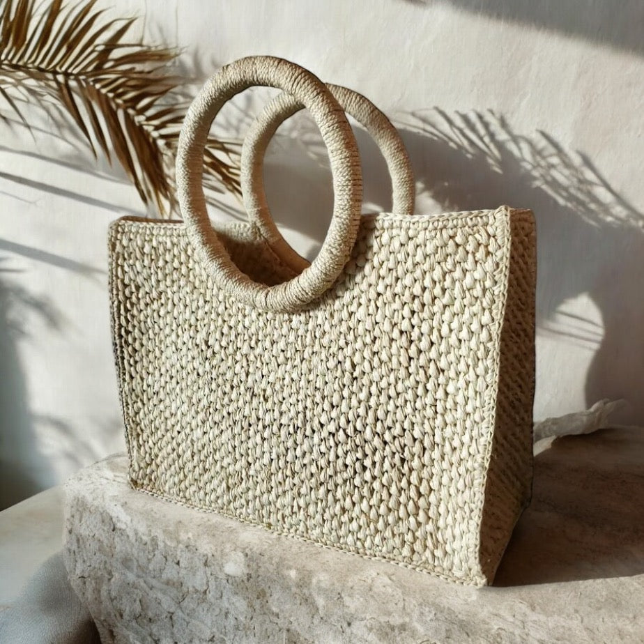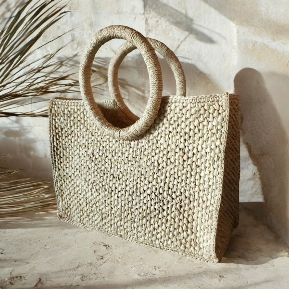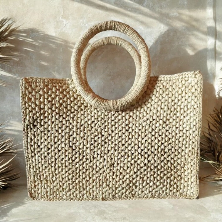 Elevate your style with our Sienna Raffia Handbag, featuring raffia wrapped hoop handle design. This gorgeous hand woven box clutch offers a simple open style with a detachable drawstring insert, making it perfect for sunny day essentials and effortlessly styling up your summer outfit. Its compact and elegant natural fashion style suits both casual and special occasions. Discover the blend of Natural style and sophistication with this timeless piece.
